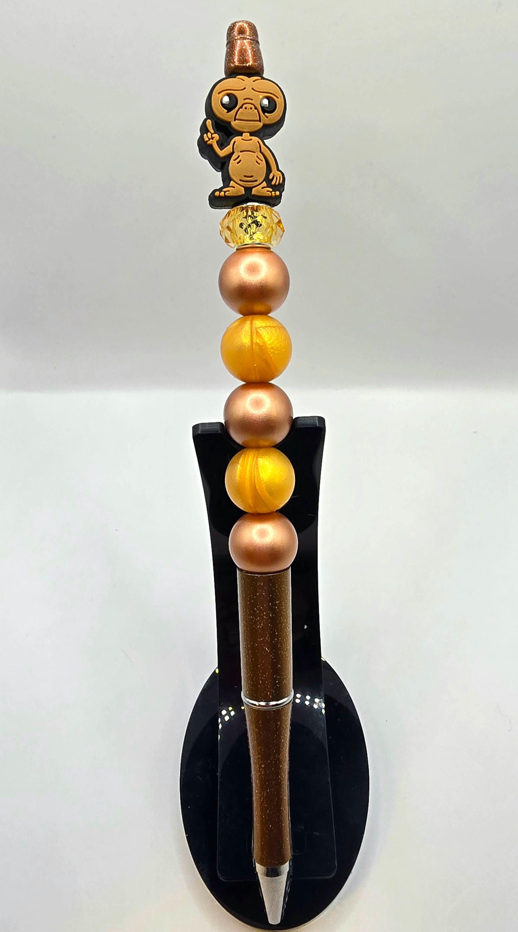 extra tall handmade beaded ballpoint pen featuring E.T. focal. Pen is refillable with beadable pen ink refills Made with -silicone beads -acrylic beads -plastic ballpoint beadable pen -black ink