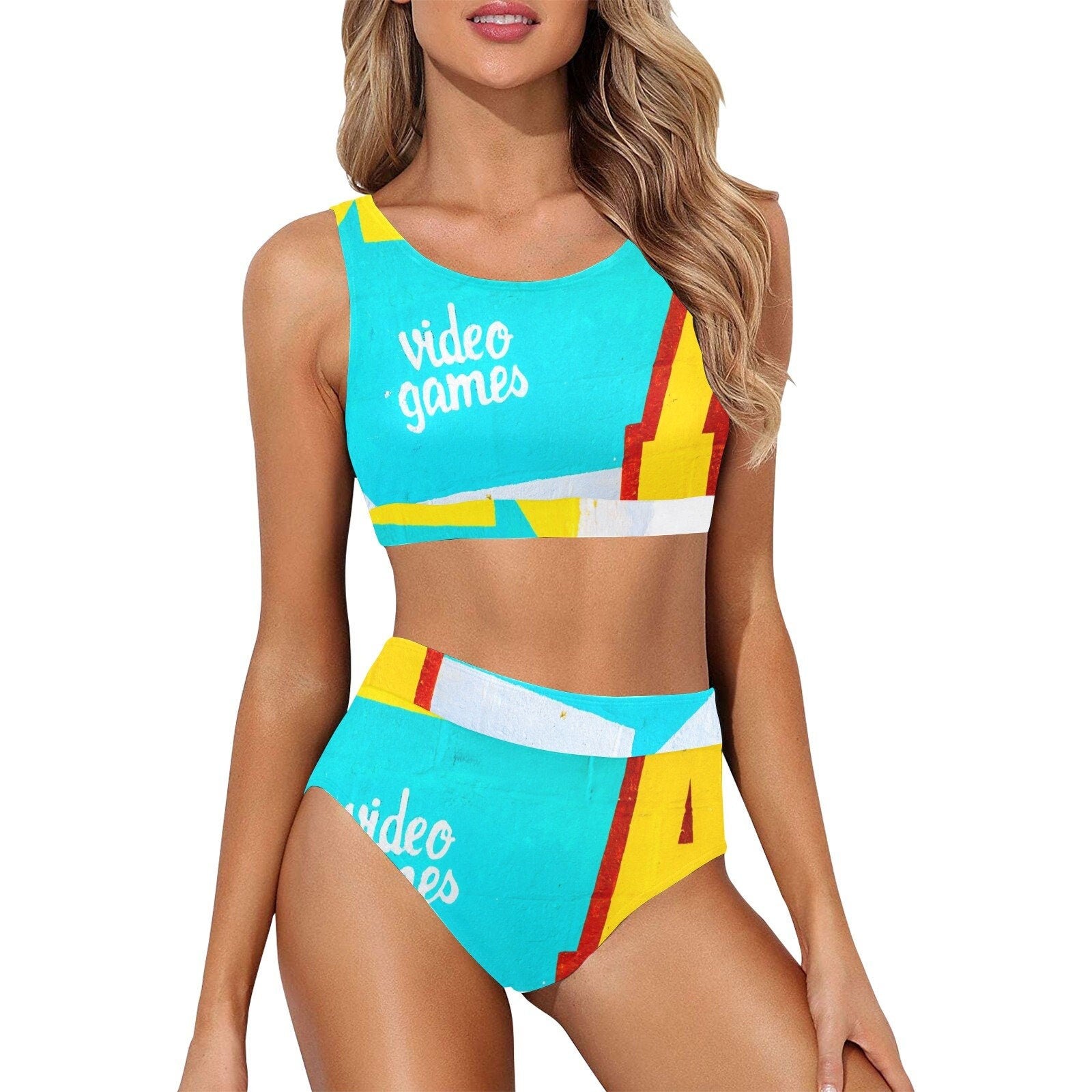 Video Games Crop Top Bikini Swimsuit Set - Coney Island Graphic Print Swim Suit - Swimwear - High Waist Bikini Bottoms - Racerback